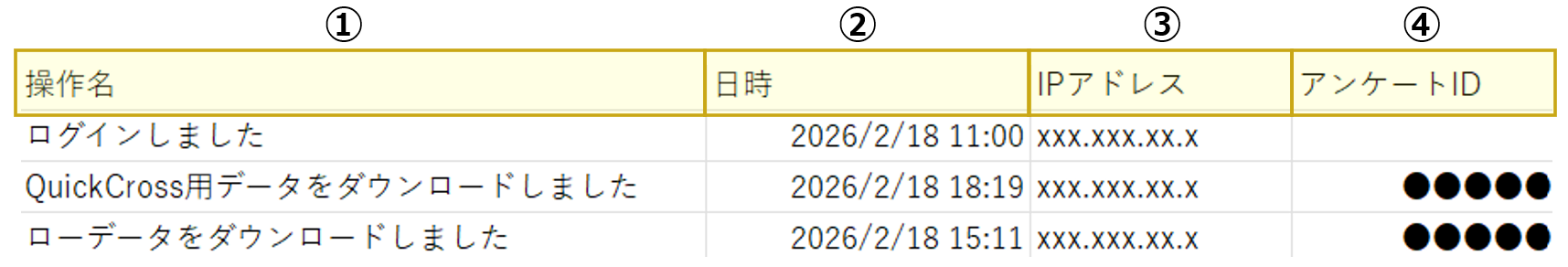 2行目以降には、操作ごとのログ情報が1行ずつ表示されます。