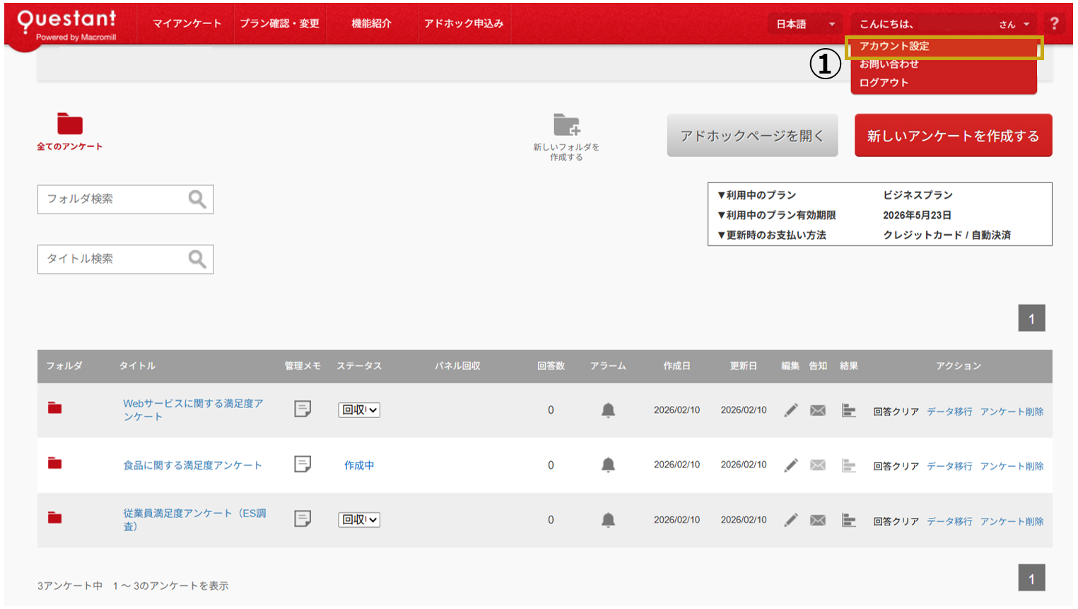 ①マイアンケートページ(ログイン後のページ)の右上にあるプルダウンより「アカウント設定」を選択します。