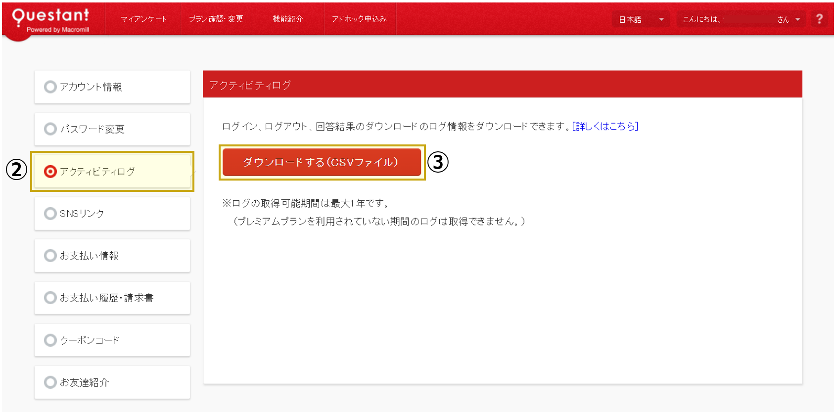 ※プレミアムプランに契約期間中のログのみがダウンロード対象です。